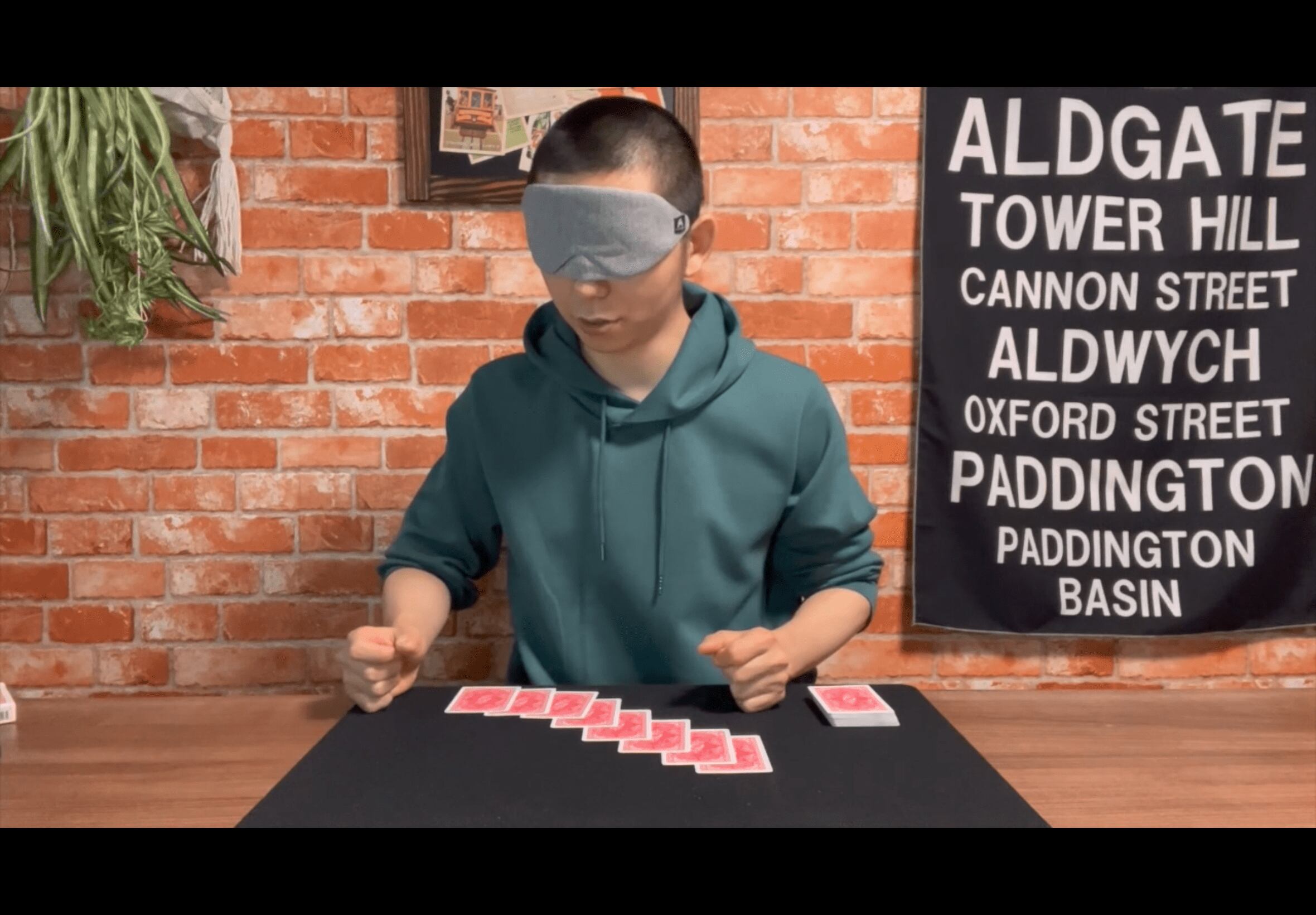 ・マジシャンは様々な方法でカードを当てますが、今回は目隠しをしカードを弾いた音だけでカードを当てます。その名も「絶対カード当てる感」と呼んでいます・・笑
